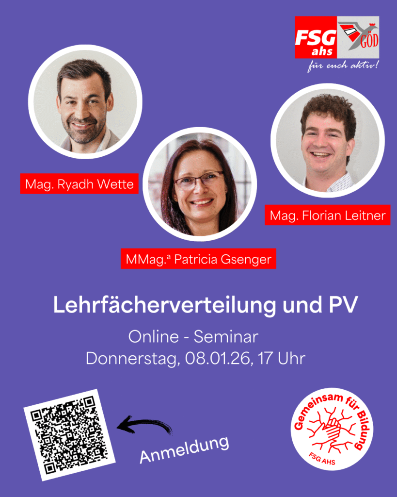Im Online-Seminar „LFV“ besprechen wir, worauf Personalvertreter:innen beim Erstellen der Lehrfächerverteilung achten müssen, geben Tipps und Raum für Fragen und Austausch. Dieses Seminar richtet sich an Mitglieder des Dienststellenausschusses und alle KollegInnen, die sich für Personalvertretungsarbeit interessieren.
