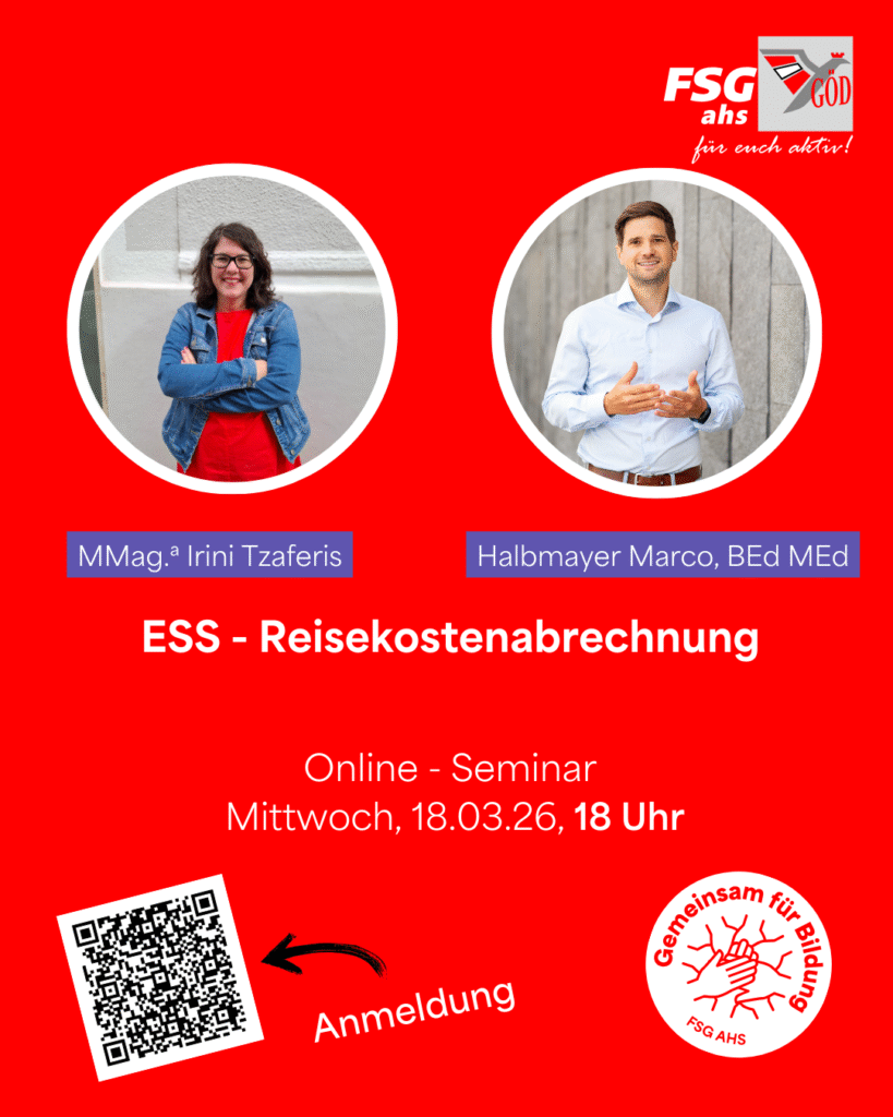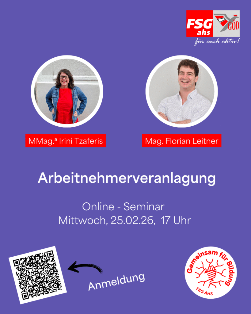 Was kann ich als Lehrperson von der Steuer absetzen? Im Online-Seminar zur Arbeitnehmerveranlagung bieten wir die Möglichkeit mit einem Experten in Steuerfragen über die Arbeitnehmerveranlagung zu sprechen. Spezielle Fragen bitte im Vorfeld per Mail an: irini.tzaferis@my.goed.at schicken.