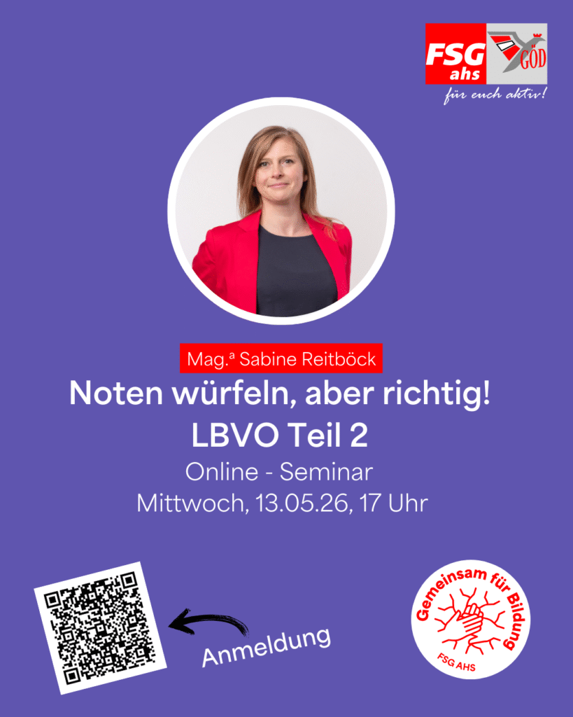 Das Online-Seminar „Noten würfeln … aber richtig“ soll einen Überblick über die Dauer, Häufigkeit und verschiedene Formen von Leistungsfeststellungen während des Schuljahres mit besonderer Berücksichtigung auf die Themen Leistungsfeststellungsprüfung und Berufung geben. Der Info-Input wird zwischen 30 und 45 Minuten dauern, anschließend bleibt noch genügend Zeit für die Beantwortung von Fragen. Gerne können schon vorab Fragen an sabine.reitboeck@my.goed.at geschickt werden.
